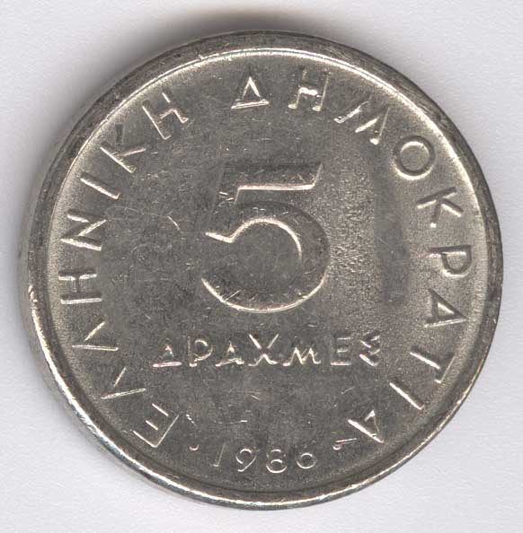 Grecia 5 Drachmai de 1986